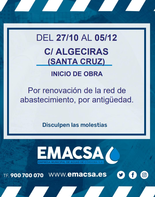 Del 27/10 al 05/12. C/ ALGECIRAS (SANTA CRUZ). Inicio de obra por renovación de la red de abastecimiento, por antigüedad.