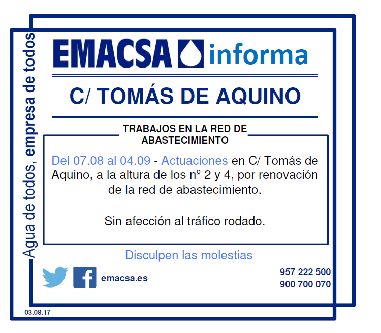 Del 07.08.2017 al 04.09.2017 – Actuaciones en C/ Tomás de Aquino, a la altura de los nº 2 y 4, por renovación de la red de abastecimiento-