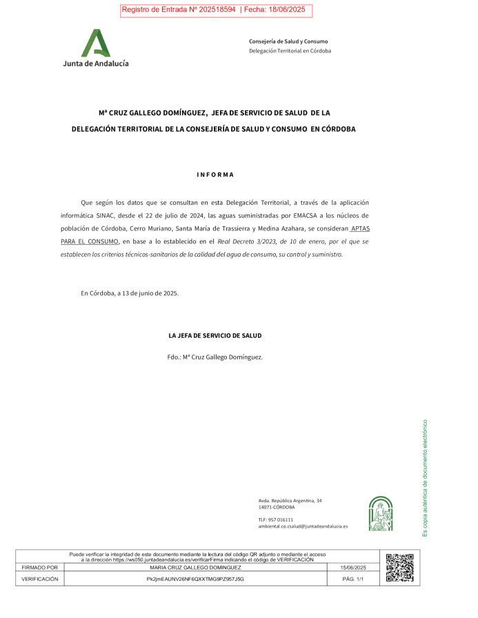 INFORMACIÓN AL CIUDADANO, en cumplimiento a lo previsto en el Anexo XI, parte B.1. del Real Decreto 3/2023, de 10 de enero, por el que se establecen los criterios técnico – sanitarios de la calidad del agua de consumo, su control y suminitro.