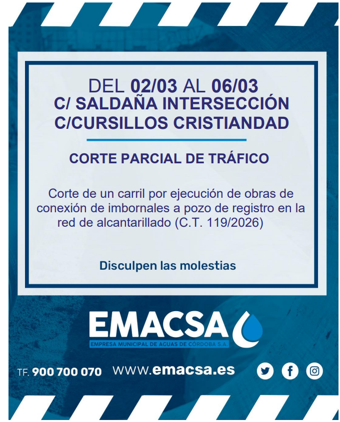 DEL 02/03 al 06/03. C/ SALDAÑA ESQ. C/ CURSILLOS DE CRISTIANDAD . Corte parcial de tráfico, por trabajos de conexión de imbornales a pozo de registro de la red de alcantarillado. (C.T.119/2026)