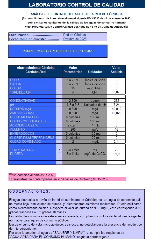 Análisis de control del agua de la red de Córdoba – Octubre 2025