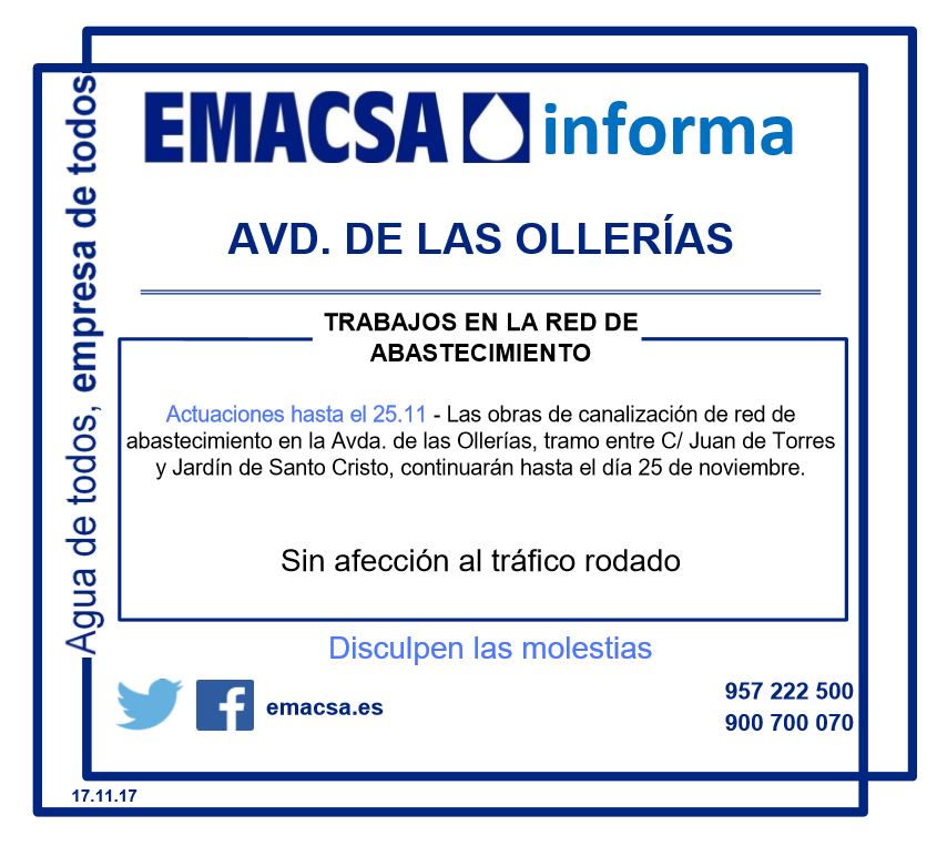 Actuaciones hasta el 25.11 – Las obras de canalización de red de abastecimiento en la Avda. de las Ollerías, tramo entre C/ Juan de Torres y Jardín de Santo Cristo, continuarán hasta el día 25 de noviembre. Sin afección al tráfico rodado