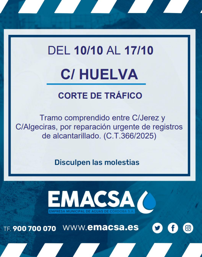 Del 10/10 al 17/10. C/ HUELVA. Corte de tráfico, por reparación urgente de registros de alcantarillado. (C.T.366/2025)