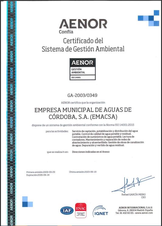 El Sistema de Gestión Ambiental, conforme a la norma UNE-EN ISO 14001, está implantado en EMACSA desde el año 2003. Actualmente, el alcance del certificado engloba las actividades que se llevan a cabo en los Centros de Trabajo: Edificio Sede de EMACSA, Centro Operativo El Granadal, ETAP de Villa Azul, EDAR La Golondrina, EDAR de Cerro Muriano, ETAP de Guadanuño, EDAR de Santa Cruz.: